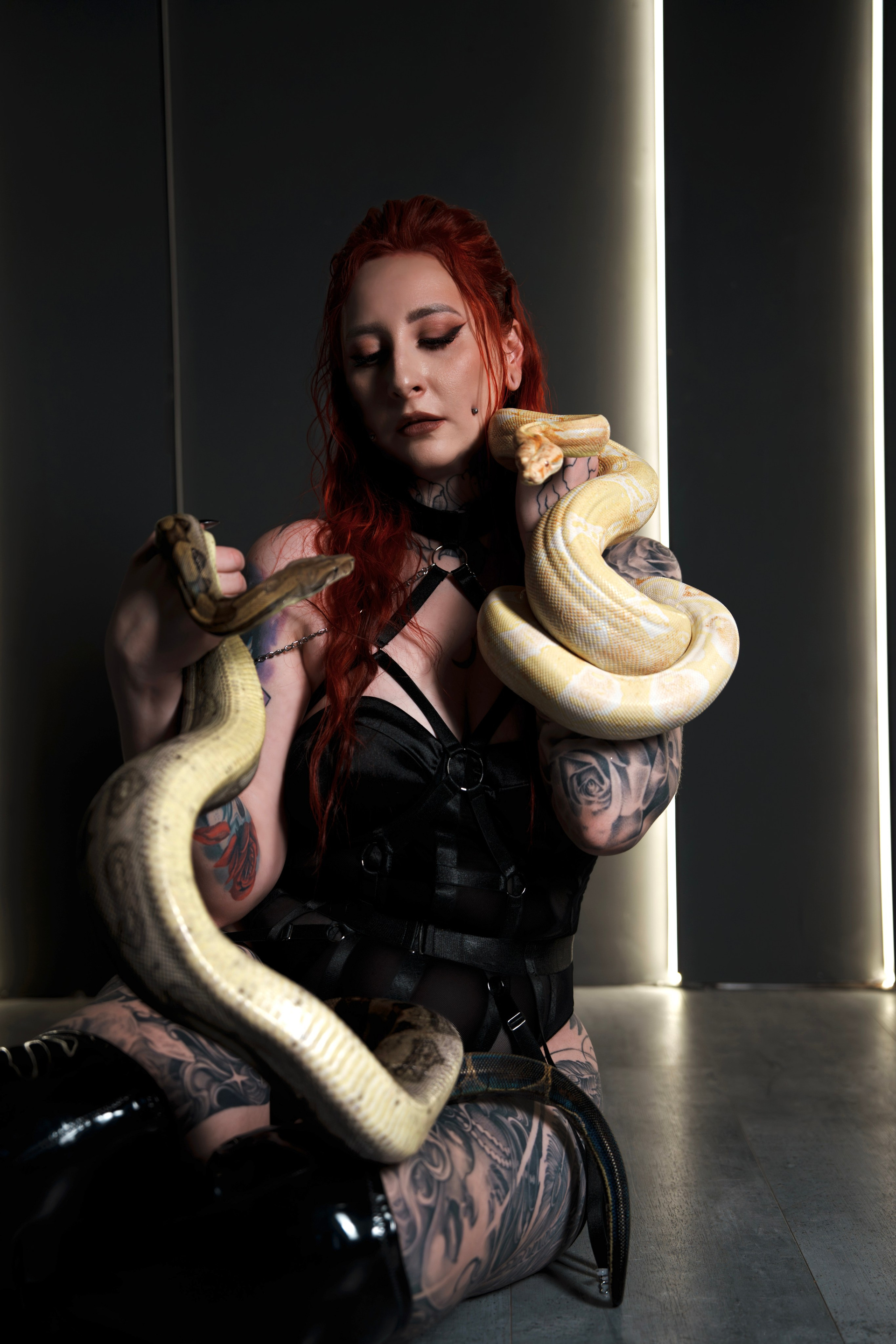 This photo shoot was done by me in a studio in Warsaw together with Victoria and my snakes boa imperators. Victoria is a stunning and striking tattooed woman who feels completely natural in front of the camera. She combines elegance, character, and a strong presence: her tattoos, distinctive beauty, and confident energy in the frame make this series feel truly cohesive. I wanted to create an atmosphere where femininity, dark aesthetics, and the natural movement of the snakes come together as one unified image. The lighting, styling, and composition all work together here to create a thoughtful and memorable visual story.