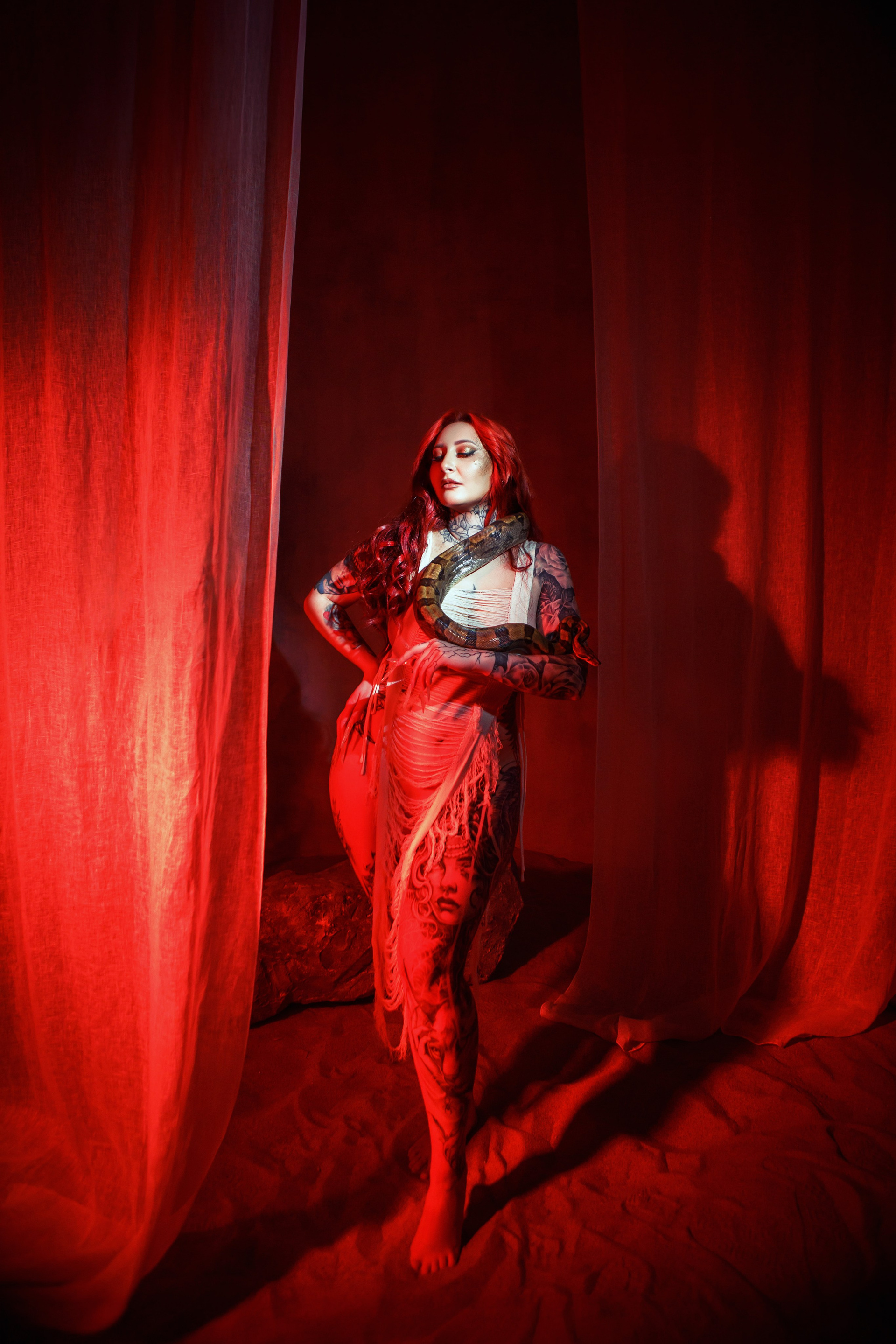 Эта серия объединяет элементы портретной и арт-фотографии, где взаимодействие модели и змеи создаёт выразительные, динамичные образы в рамках студийной эстетики. Фотосессия фокусируется на визуальном контрасте между плавными, органичными линиями змеи и пластикой поз модели, а также на тщательно выстроенном студийном освещении, подчеркивающем формы, текстуру и детали.